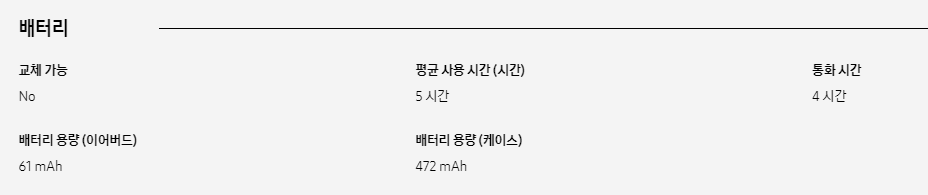 버즈 프로는 5시간 동안 사용이 기능하다. 교체할 수는 없다고 나와있다.