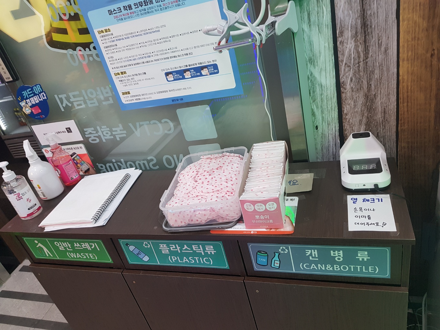 입구를 들어서면 쓰레기통 위에 마이크 커버와 qr 방문 코드를 인증하는 장치가 있다.